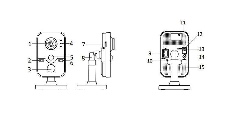 - Индикатор: "тревога": постоянно горит красный, когда камера работает; горит синим, когда камера не работает. "статус": горит синим когда камера работает правильно; горит красным, когда камера прекращает работу. "соединение": мигает желтым при подключении к сети; горит, когда сеть отключена;